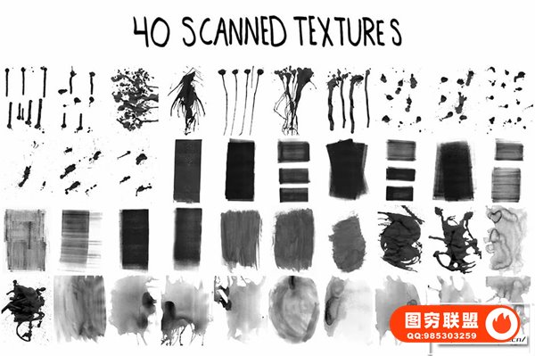 扫描纹理40 个扫描墨水纹理。每一张都以 600 dpi 的分辨率扫描并保存为扁平的 tiff 文件。包括的纹理:滴、滴、涂抹、墨辊、墨迹和墨蜘蛛。