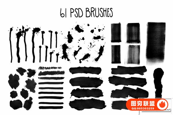 PSD 画笔4 套(水滴、滴水、滚轮和画笔描边),总共 61 个独特的画笔。画笔大小:459 px(水滴)至 2454 px(大笔划)