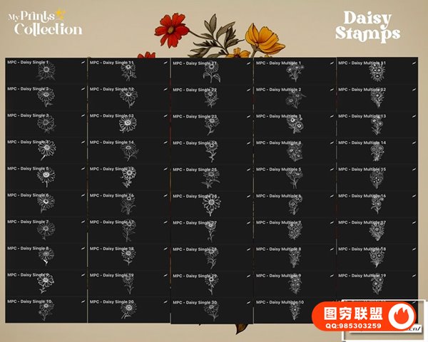 增强您的艺术项目:这些邮票非常适合创建引人注目的插图、设计、图案等,并带有令人愉悦的雏菊风格。