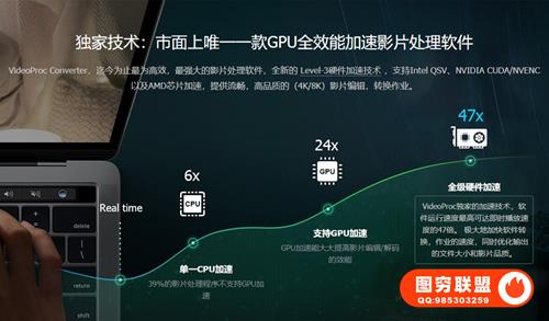 同时,这款软件支持Level-3硬件加速技术,搭配 Intel QSV、NVIDIA CUDA/NVENC以及AMD芯片加速单元,以实时播放的47倍速度快速执行各种影片作业!