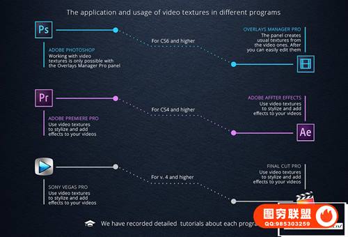 您可以使用视频纹理于:Adobe Photoshop,Adobe Premiere Pro,Adobe After Effects,Sony Vegas,Final Cut Pro等