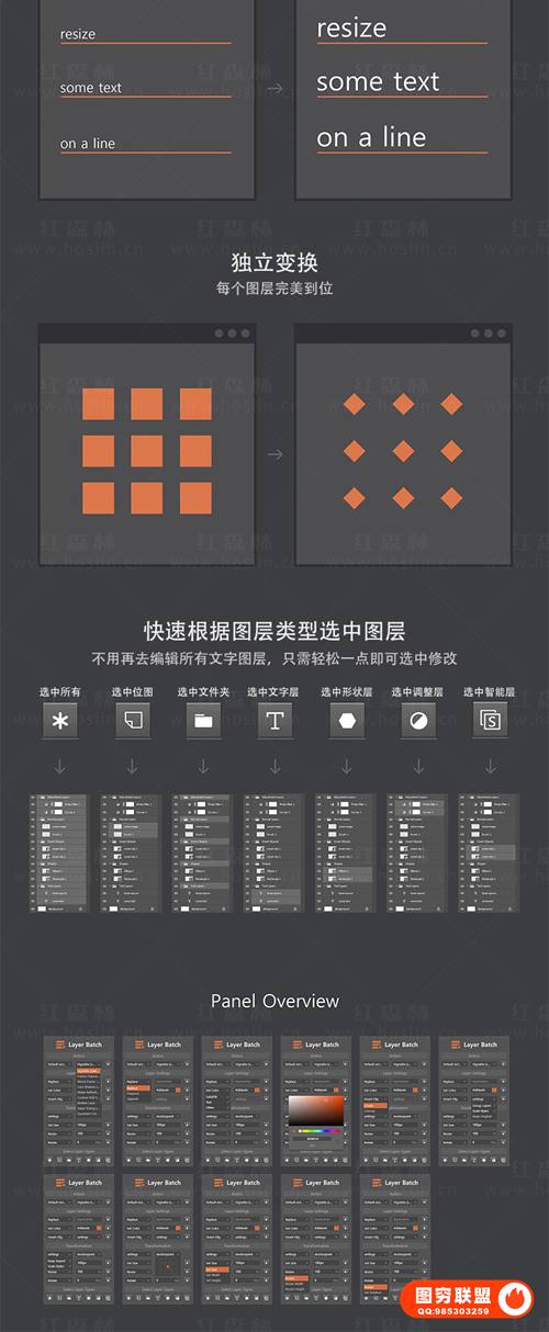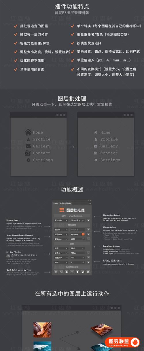 Layer Batch图层批处理批量通过一次编辑所有选定的图层,可以在Photoshop中节省大量的时间,还可以一次调整多个图层的大小,旋转,着色或重命名。除了这些您还可以创建或解包多个智能对象。如果还有其他用例,则可以简单地创建自己的操作,并使用面板为所有选定的图层运行该操作。