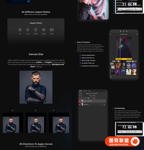 一款专业的 Photoshop 插件,具有高级工具,可以毫不费力地编辑您的图像,通过一键应用功能节省您手中的最佳时间,易于安装和完全可编辑的结果。Photo Lab 使用由 Photoshop 和智能算法提供支持的先进技术,为您的图像提供美丽的外观并 360 度更改它,这使您可以在几分钟内轻松编辑图像。