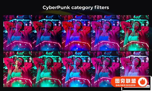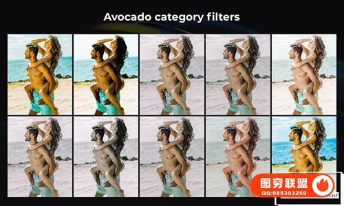 6 个类别中的 60 多个滤镜(Instagram – Blacked – Film – B&W – CyberPunk – Avocado)。