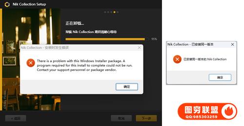 很多用户在安装了Nik Collection插件之后卸载时出现错误而卸载失败,通过手动删除插件文件夹也不行。重新安装却提示“已存在同一版本/更高版本”,如下图