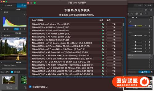 改进 D.x.O 光学模块管理:现提供“下载全部”复选框,让您快速获取自动校正图像所需的所有光学模块。
