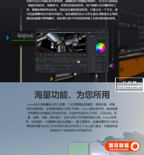 Fusion是一款先进的合成软件,它被广泛应用于视觉特效、广电影视设计、动态图形设计以及3D动画设计等领域。在过去的30年里,Fusion被数千部好莱坞电影和电视节目所采用。Fusion搭载功能强大、基于节点的界面,让您通过连接不同类别的图像处理工具,快速方便地创建复杂的特效!此外,它还拥有大量实用工具,惊人的VR功能和3D支持,GPU加速性能,无限网络渲染等功能!Fusion能为您提供一切所需,助您打造出精彩绝伦的广播图文、动感炫目的标题字幕,乃至电影大片的视觉特效!